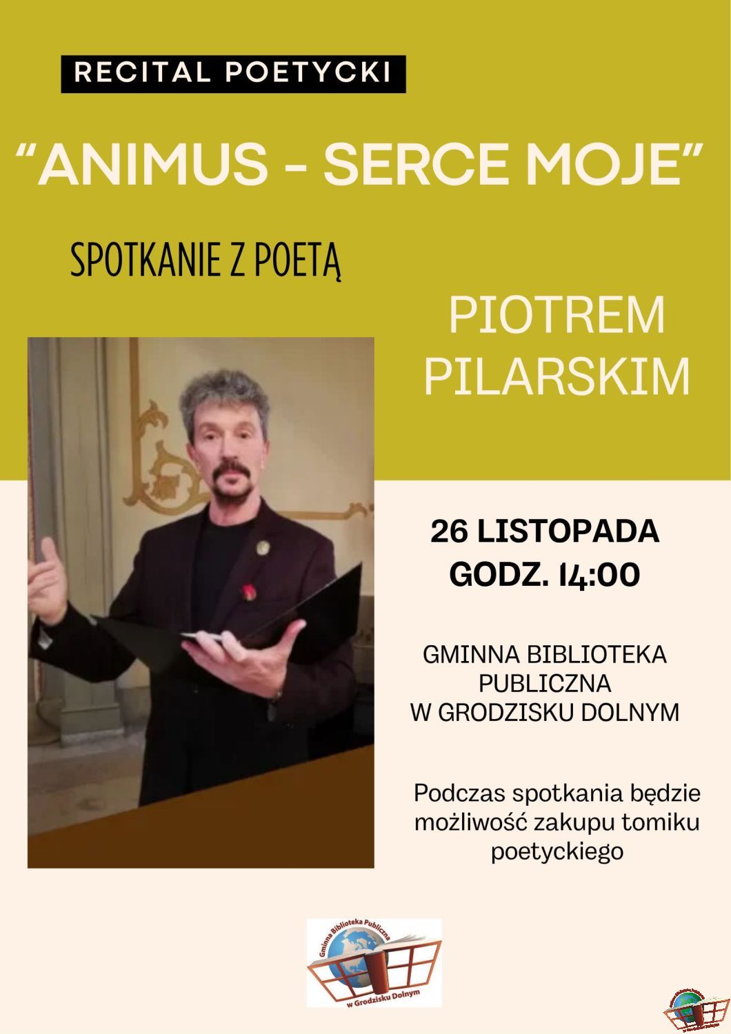 W środę 26 listopada Gminna Biblioteka Publiczna w Grodzisku Dolnym zaprasza na recital poetycki Piotra Pilarskiego „Animus – serce moje”. Piotr Pilarski jest poetą i aktorem. Urodził się w Stawiszynie, w powiecie kaliskim, a obecnie mieszka w Ostrowie Wielkopolskim. Program zatytułowany „Animus – serce moje” prezentuje cykl poetycki „Animus”, wydany w tomiku poezji „Szuflada”.